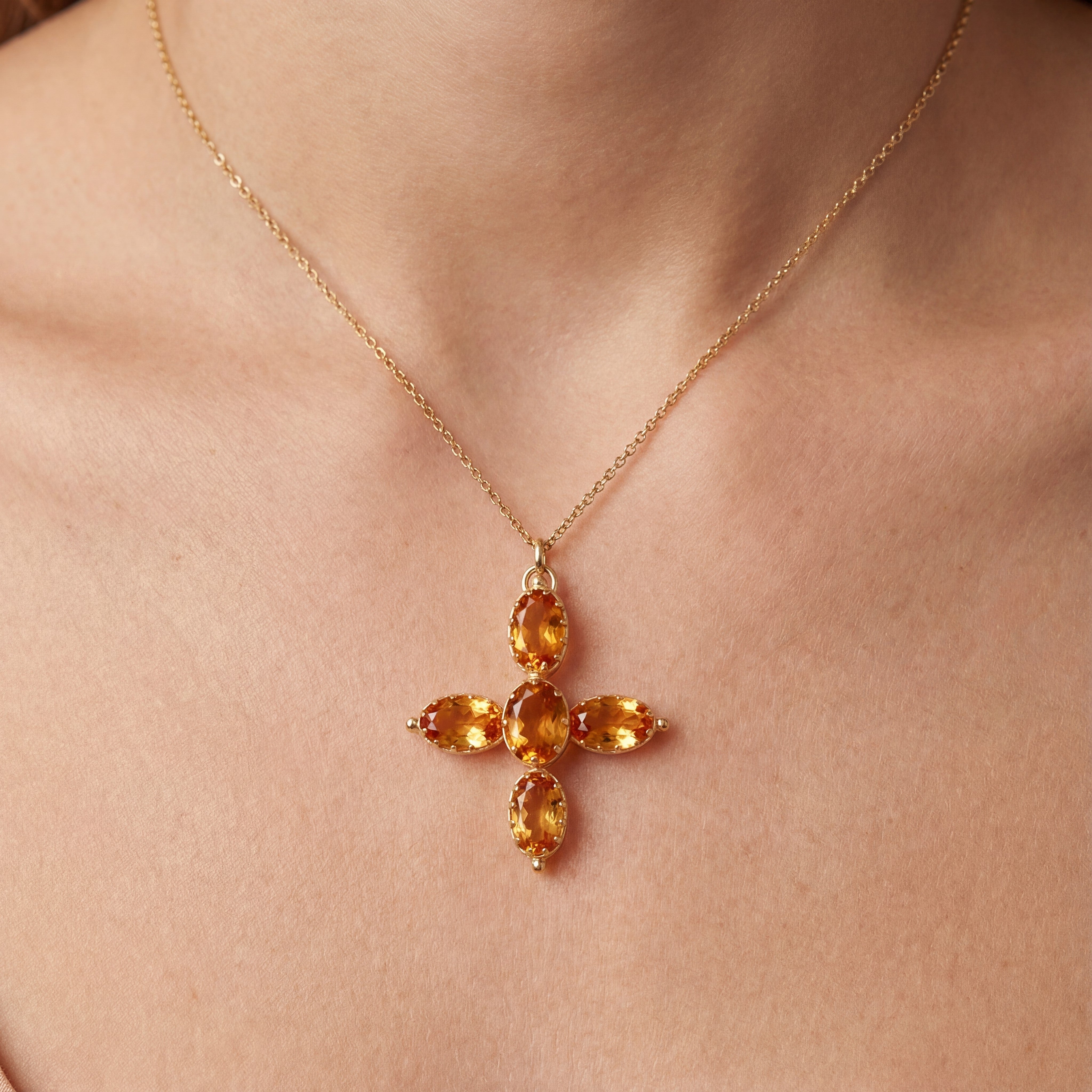 These replicas are 9ct gold and are hand set with a dark citrine, specially sourced to be as close in colour to the topaz in the sisters crosses. Every setting has been expertly and delicately replicated down to the tiniest detail.